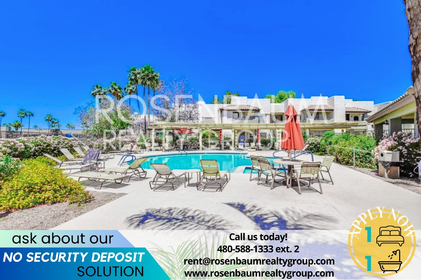 For move in cost and details on our NO SECURITY DEPOSIT option & our Resident Benefit Program, call us today at 480-588-1333 ext. 2 or email us at rent@rosenbaumrealtygroup.com