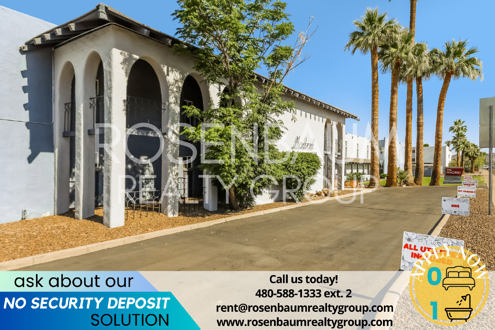 For any questions or further information, please call Leasing at 480-588-1333 ext. 2 or email us at rent@rosenbaumrealtygroup.com